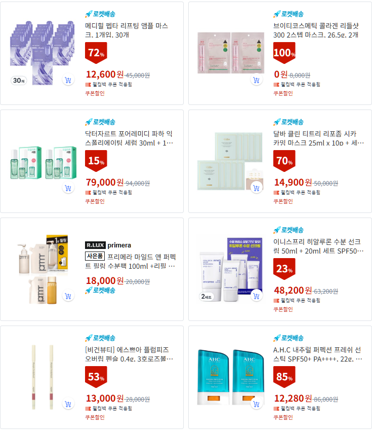 앰플 마스크, 스팟 패치, 클렌징폼 등 다양한 마스크팩과 스킨케어 제품들을 최대 100% (웰컴백 쿠폰 적용 시!) 할인된 가격에 경험할 수 있습니다.
