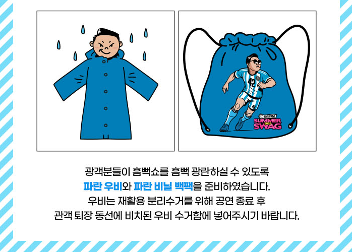 흠뻑쇼라는 이름처럼, 물에 흠뻑 젖을 각오를 해야 합니다! 즐거운 관람을 위해 몇 가지 준비물을 챙겨가세요.