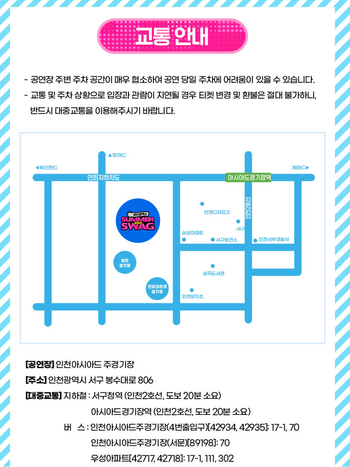 인천 아시아드 주경기장은 대중교통 접근성이 좋은 편입니다. 대규모 인파가 몰리는 공연 당일에는 대중교통 이용을 적극 권장합니다.