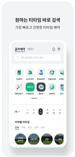 홈 화면 상단에 검색바가 있어서 원하는 날짜, 지역, 골프장 이름 검색하면 티타임이 쫙 나와요.
