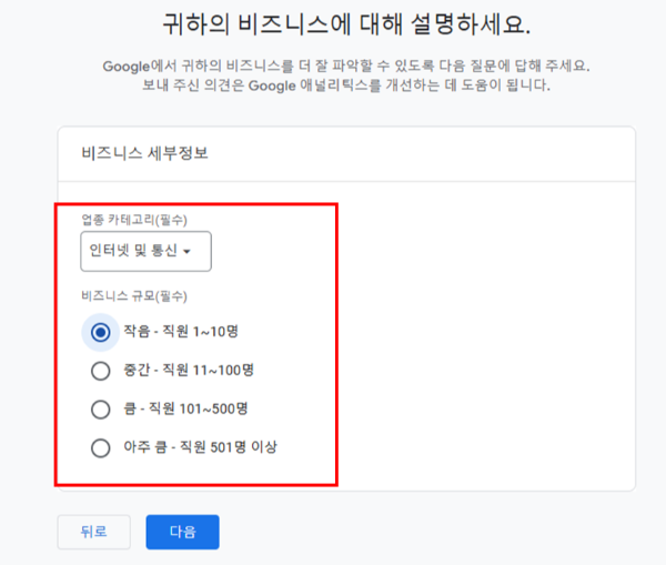 4. 업종 카테고리 및 비즈니스 규모: 임의 설정, '작음' 추천