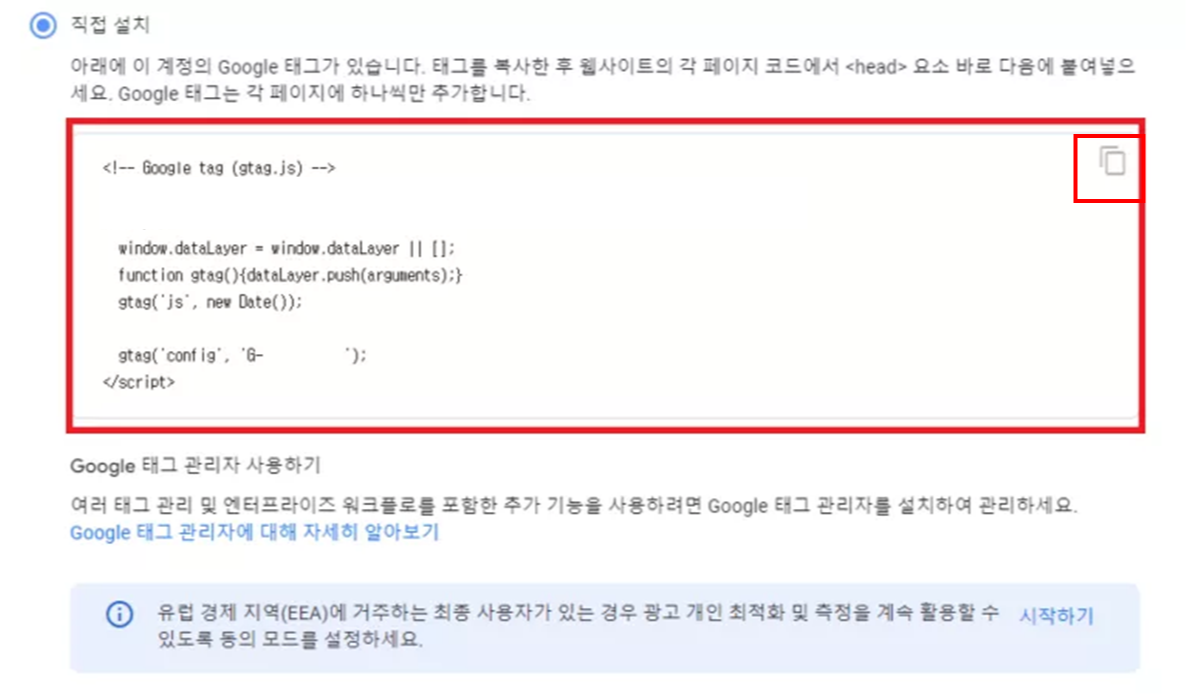 8. 구글 태그를 '직접 설치'로 선택하여 태그 코드를 복사합니다.