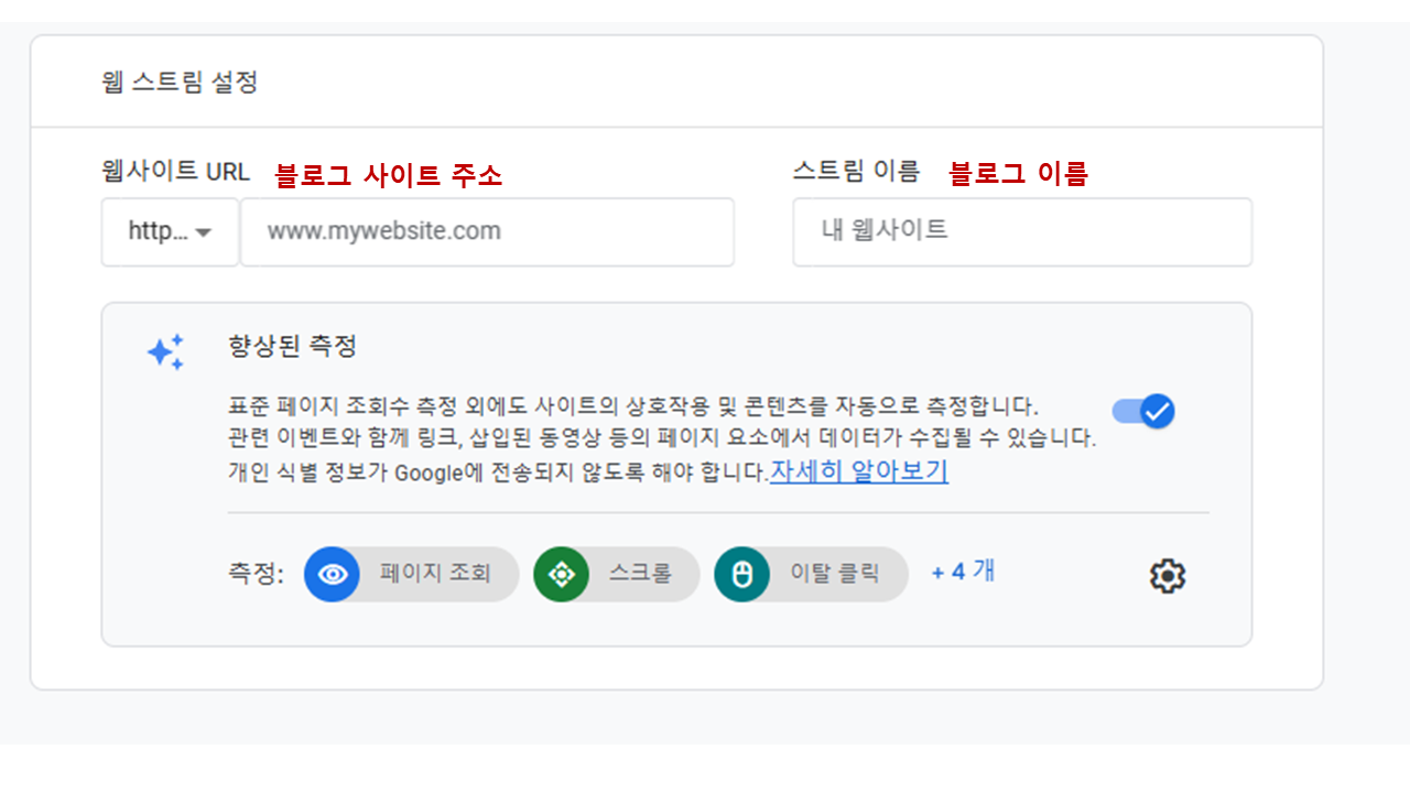 7. 웹사이트 URL을 입력하고 스트림 이름을 블로그 이름으로 설정합니다.