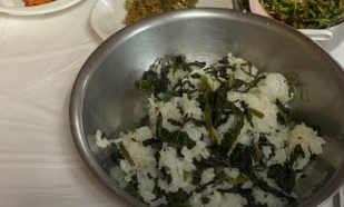 - 밥 짓기: 냄비나 솥에 불린 쌀과 밑간한 곤드레 나물을 올리고 평소 밥물 양과 동일하게 물을 붓습니다. (곤드레 나물에서 수분이 나오므로 약간 적게 잡아도 좋습니다.) 곤드레밥 밥상의 기본이 되는 밥 짓기입니다.