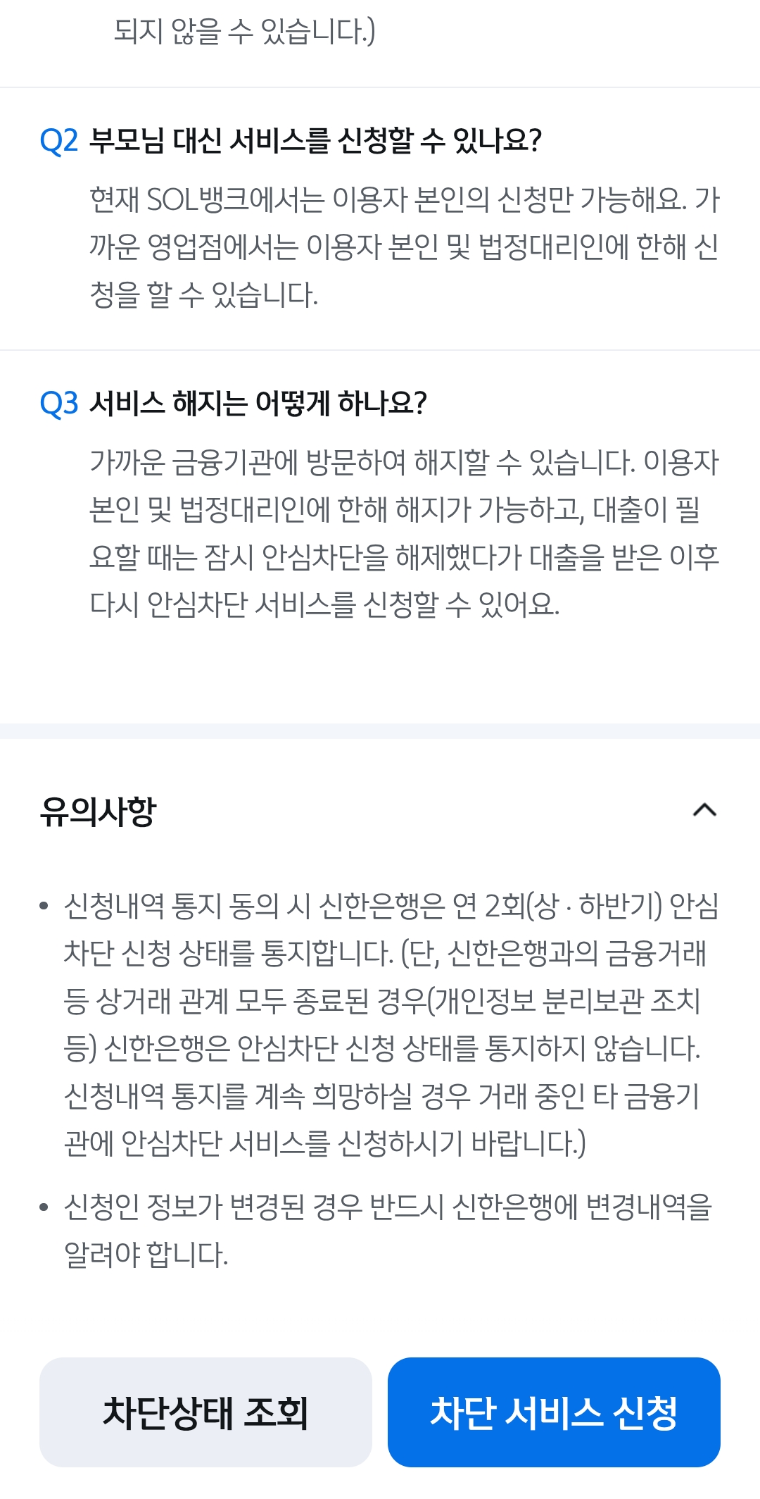 차단 서비스 신청 후 해지를 원할 경우에는 반드시 영업점을 직접 방문해야 하며, 이는 오히려 보안을 강화하는 방식입니다.