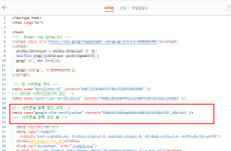 구간 안쪽에 복사한 메타 태그 붙여넣기- 저장 버튼 클릭 후 반영 여부 확인